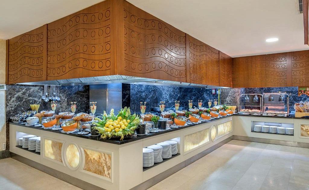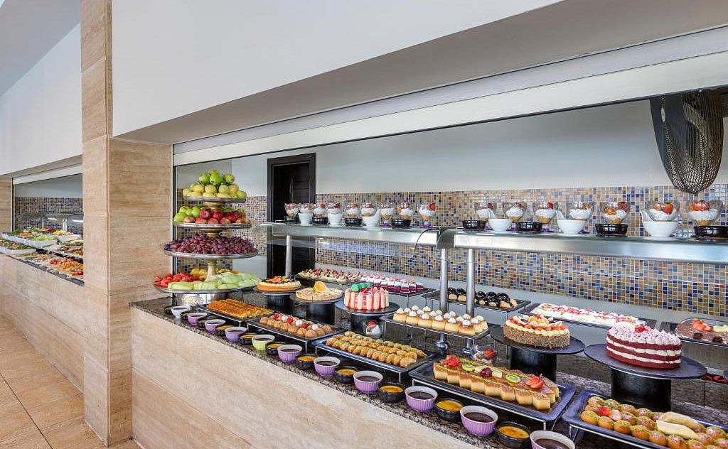 В концепцию входит: завтрак, поздний завтрак, обед и ужин - шведский стол (в связи с пандемией открытый буфет находится за стеклом, подача блюд осуществляется работниками кухни, время работы ресторанов продлено), поздний ужин, закуски в течение дня, мороженое, кондитерская, свежевыжатый апельсиновый сок на завтрак, детский стол во время обеда и ужина, гала-ужин у бассейна 1 раз в 2 недели, диетическое и вегетарианское меню, безлактозное и безглютеновое меню, местные и некоторые импортные алкогольные и безалкогольные напитки.