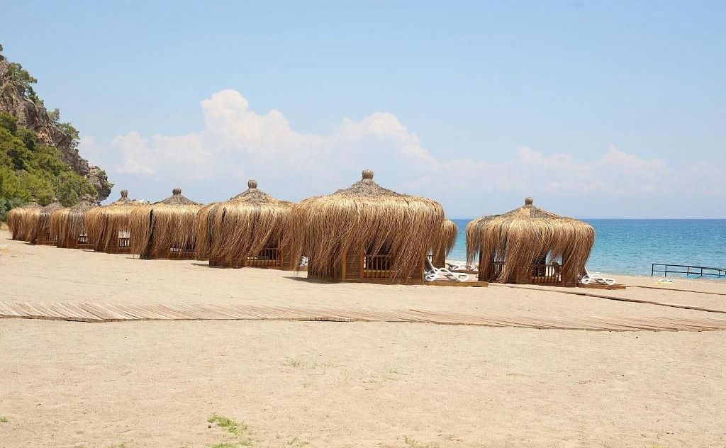 Собственный песчано-галечный пляж находится рядом с отелем. Протяженность пляжа составляет 630 метров. Шезлонги, зонтики, пляжные полотенца (по карточке) - бесплатно. Заход в море - песок, галька. Бар на пляже - прохладительные напитки, вино, шампанское и пиво, 06.00-07.00 - горячие напитки. Павильоны на пляже - платно.