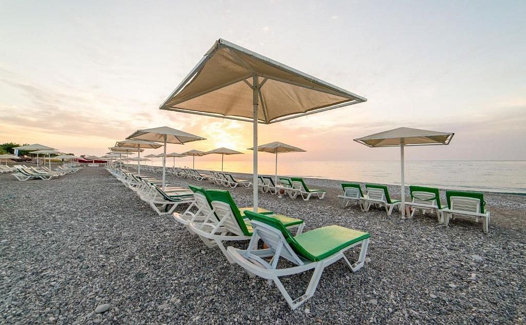Собственный песчано-галечный пляж, оборудованный пирсом, расположен через дорогу от отеля. Шезлонги, зонтики, матрасы и полотенца предоставляются бесплатно.